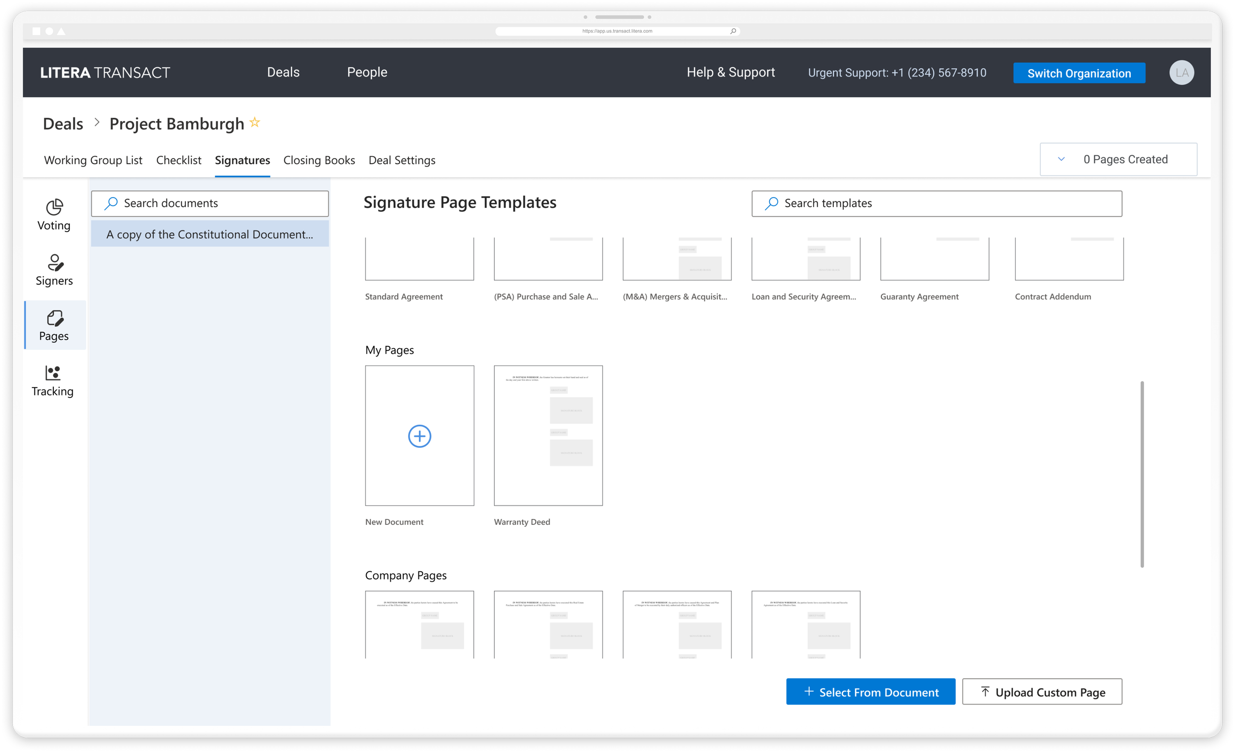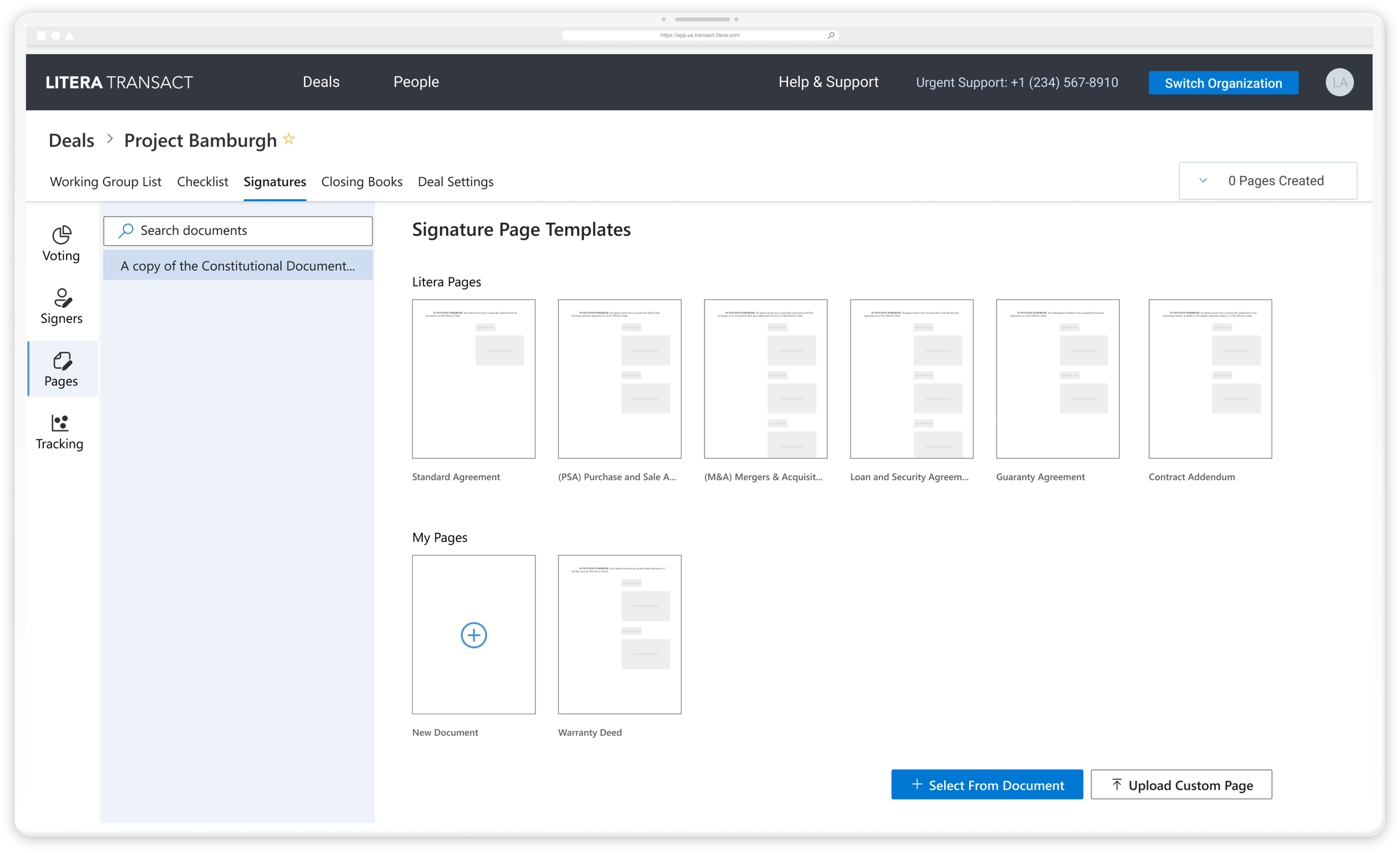 We offered both the option to upload a custom template (a document the firm already had) as well as the option to build a signature page directly within Transact.