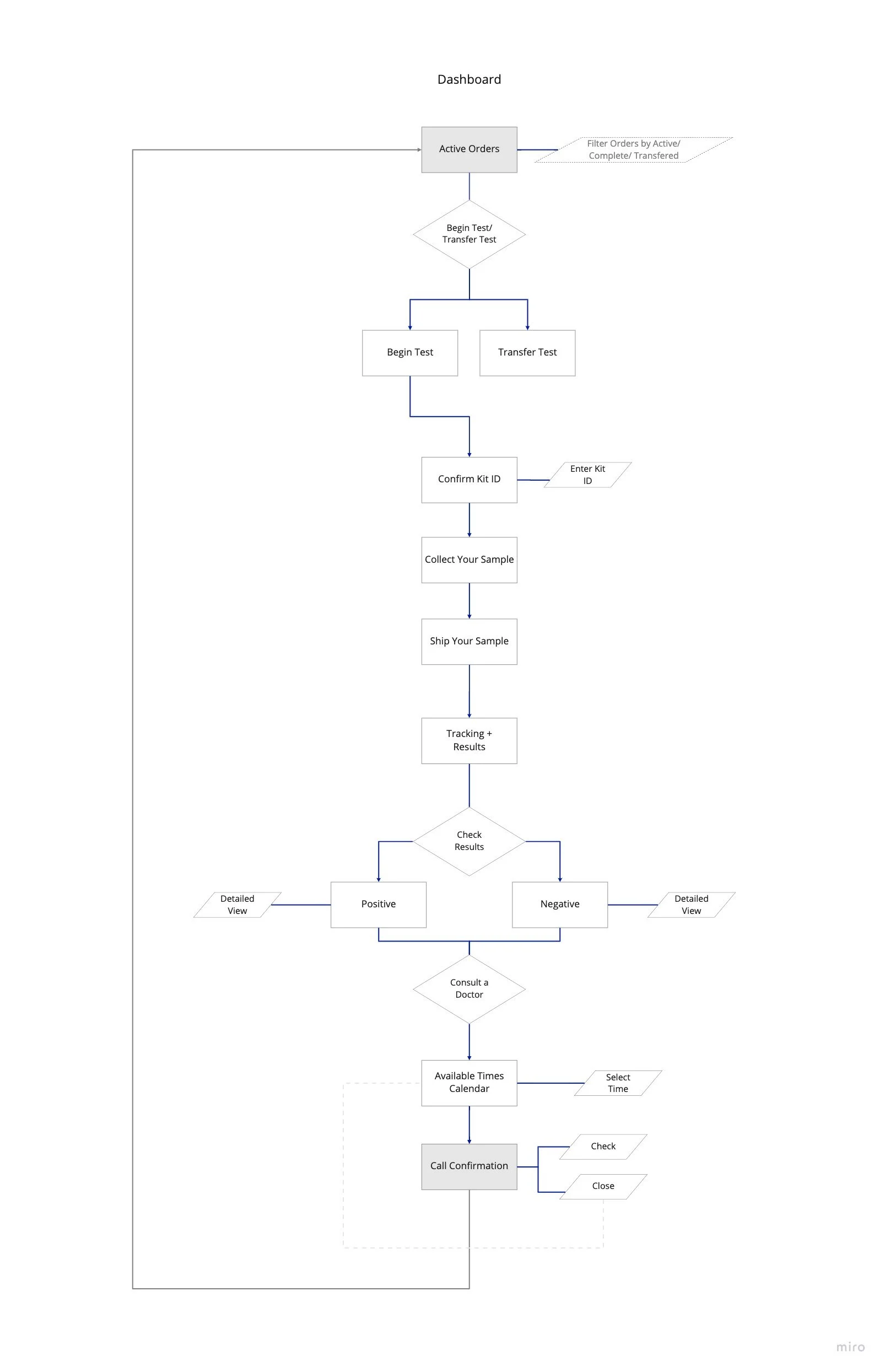 In this new flow I’ve accounted for test transfers, renamed the steps to what the user will be doing at each point in time, and added in what would happen when consulting a doctor.