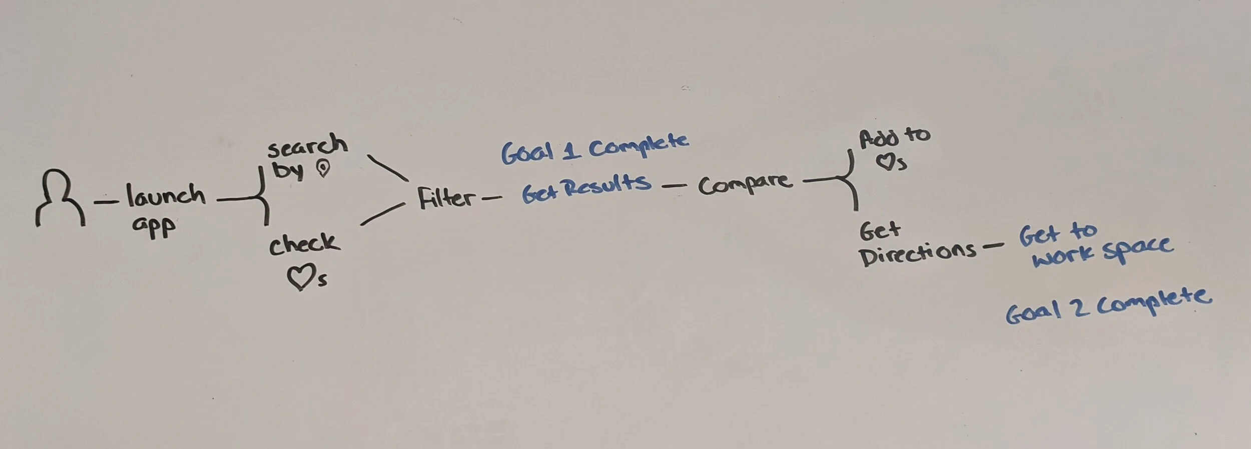 For my solution sketch, I realized that filtering to fit the user’s personalization might take more than just one screen. I focused on my critical screen for filtering by things they want in the workspace, the previous to browse by work type and determine the atmosphere needed, and the last screen as the list of places that they can compare from.